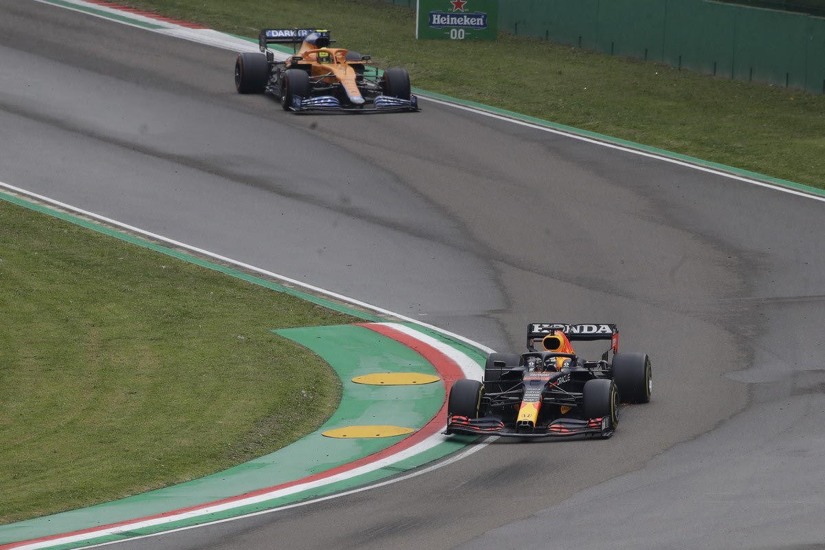 Red Bull driver Max Verstappen of the Netherlands is chased by Mclaren driver Lando Norris of Britain during the Emilia Romagna Formula One Grand Prix, at the Imola racetrack, Italy, Sunday, April 18, 2021. (AP Photo/Luca Bruno)