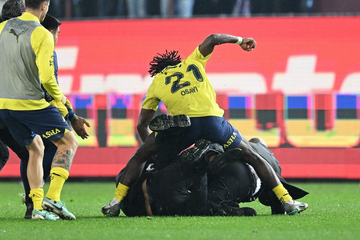 Όταν οι παίκτες είχαν συγκεντρωθεί στο κέντρο του γηπέδου, δεκάδες οπαδοί των γηπεδούχων εμφανίζονται να έχουν πηδήξει από τις κερκίδες και να τρέχουν προς το μέρος των παικτών της Φενέρμπαχτσε, της προσεχούς αντιπάλου του Ολυμπιακού για τα προημιτελικά του Conference League. Αυτοί δεν έμειναν με σταυρωμένα χέρια. Ο Μπράιτον Οσάγι-Σάμουελ με μία εναέρια κλοτσιά έριξε στο γρασίδι έναν οπαδό και στη συνέχεια άρχισε να τον γρονθοκοπεί.