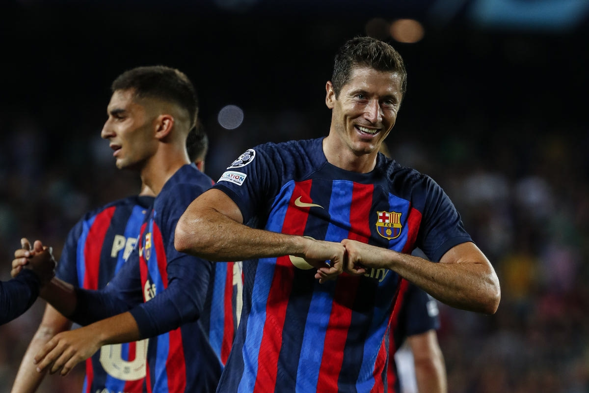 Ο Ρόμπερτ Λεβαντόβσκι πανηγυρίζει το γκολ που πέτυχε στην αναμέτρηση της Μπαρτσελόνα με τη Βικτόρια Πλζεν