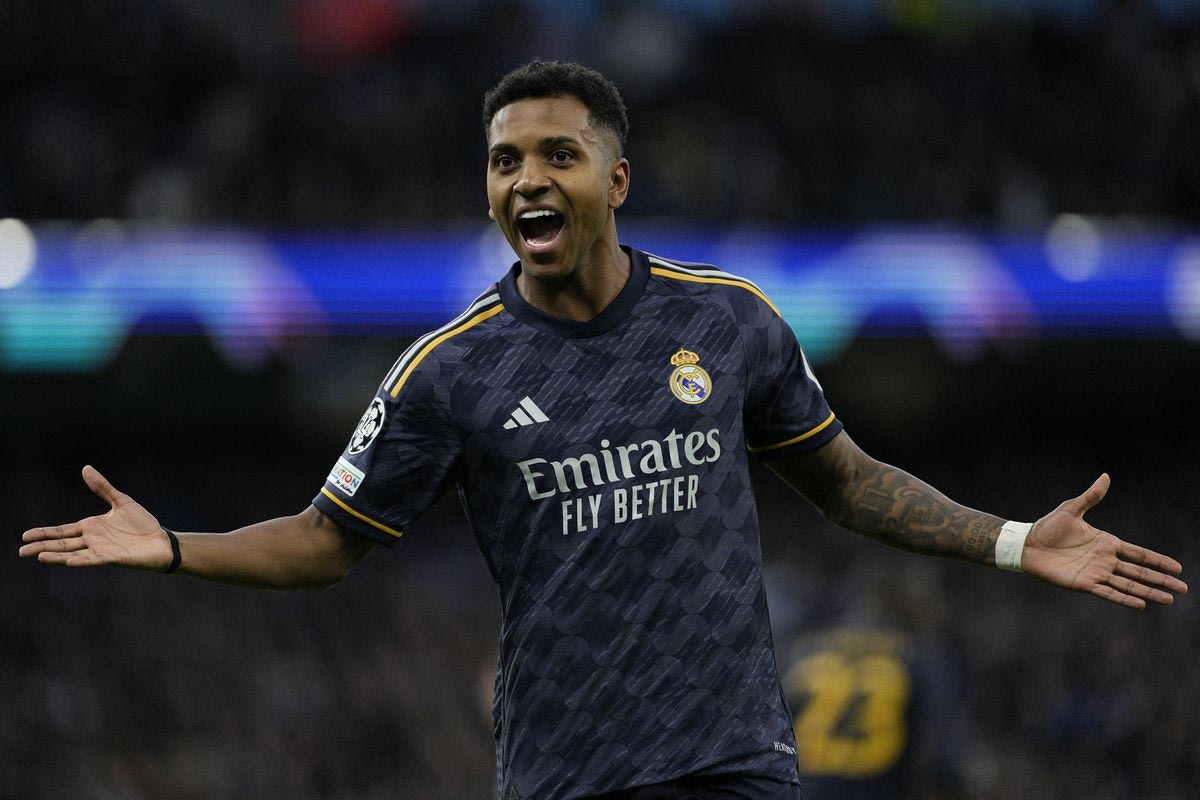 Ο Ροντρίγκο της Ρεάλ πανηγυρίζει γκολ που σημείωσε κόντρα στη Μάντσεστερ Σίτι για τα προημιτελικά του Champions League 2023-2024 στο "Ετιχάντ", Μάντσεστερ | Τετάρτη 17 Απριλίου 2024