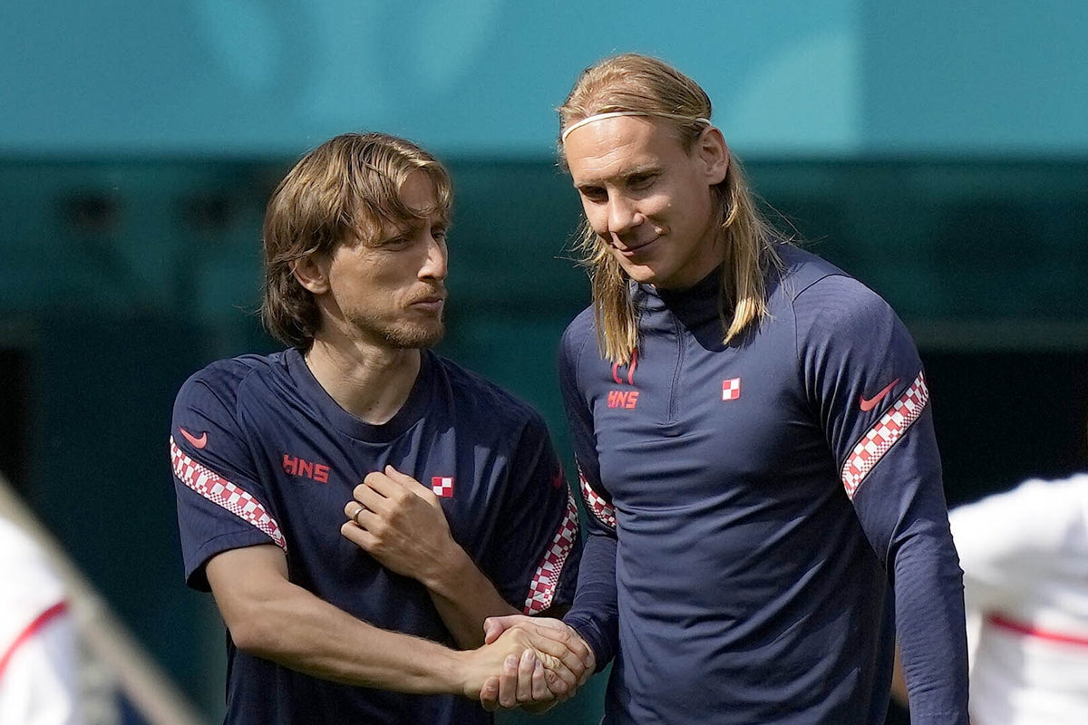 Ο Λούκα Μόντριτς κι ο Ντομαγκόι Βίντα στην προθέρμανση της Κροατίας στο Euro 2020