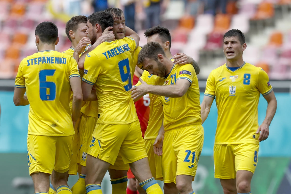 Οι παίκτες της εθνικής Ουκρανίας πανηγυρίζουν γκολ κόντρα στη Βόρεια Μακεδονία