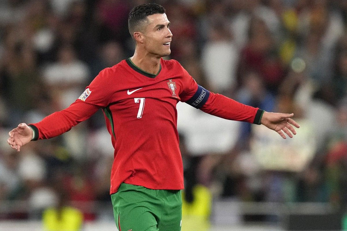 Portugal's Cristiano Ronaldo celebrates after the UEFA Nations League soccer match between Portugal and Scotland at the Luz stadium in Lisbon, Portugal, Sunday, Sept. 8, 2024. (AP Photo/Armando Franca) @2024 Armando Franca/AP IMAGES