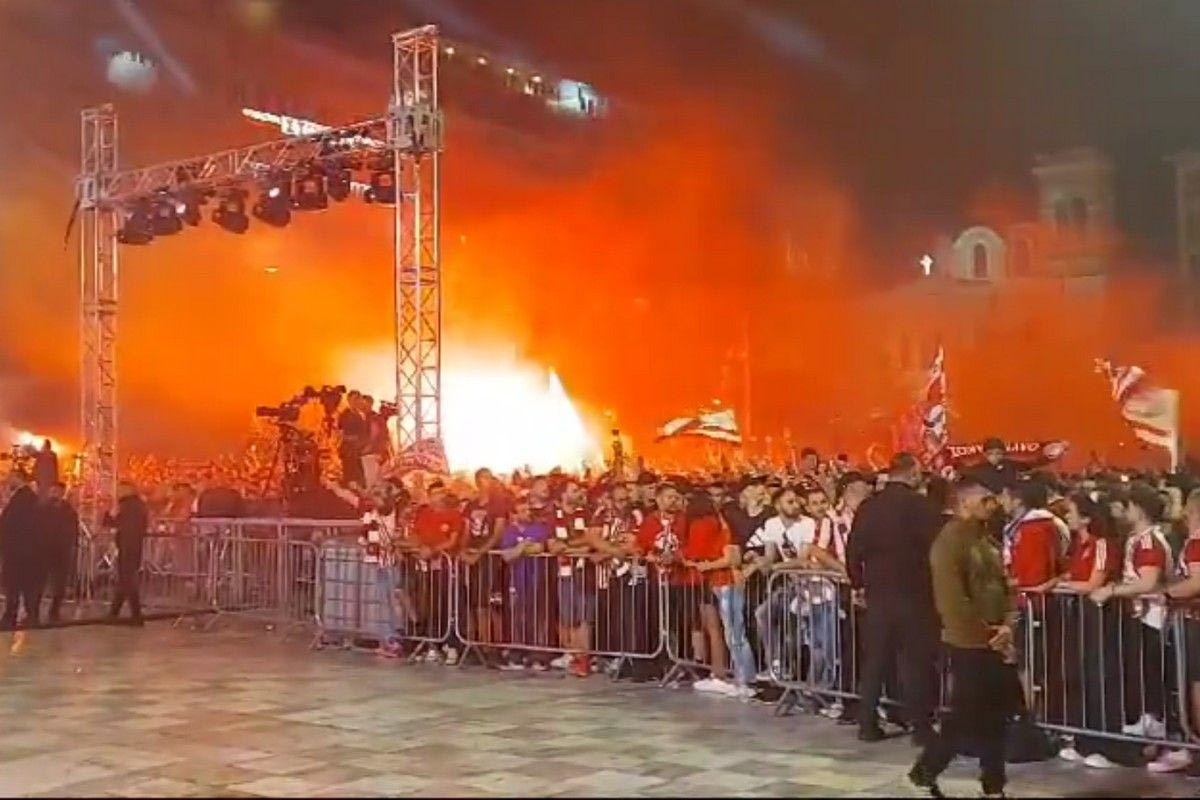 Ολυμπιακός: Πάρτι με τον ερυθρόλευκο ύμνο και με τραγούδια στον Πειραιά, εν αναμονή του ανοιχτού λεωφορείου της ομάδας