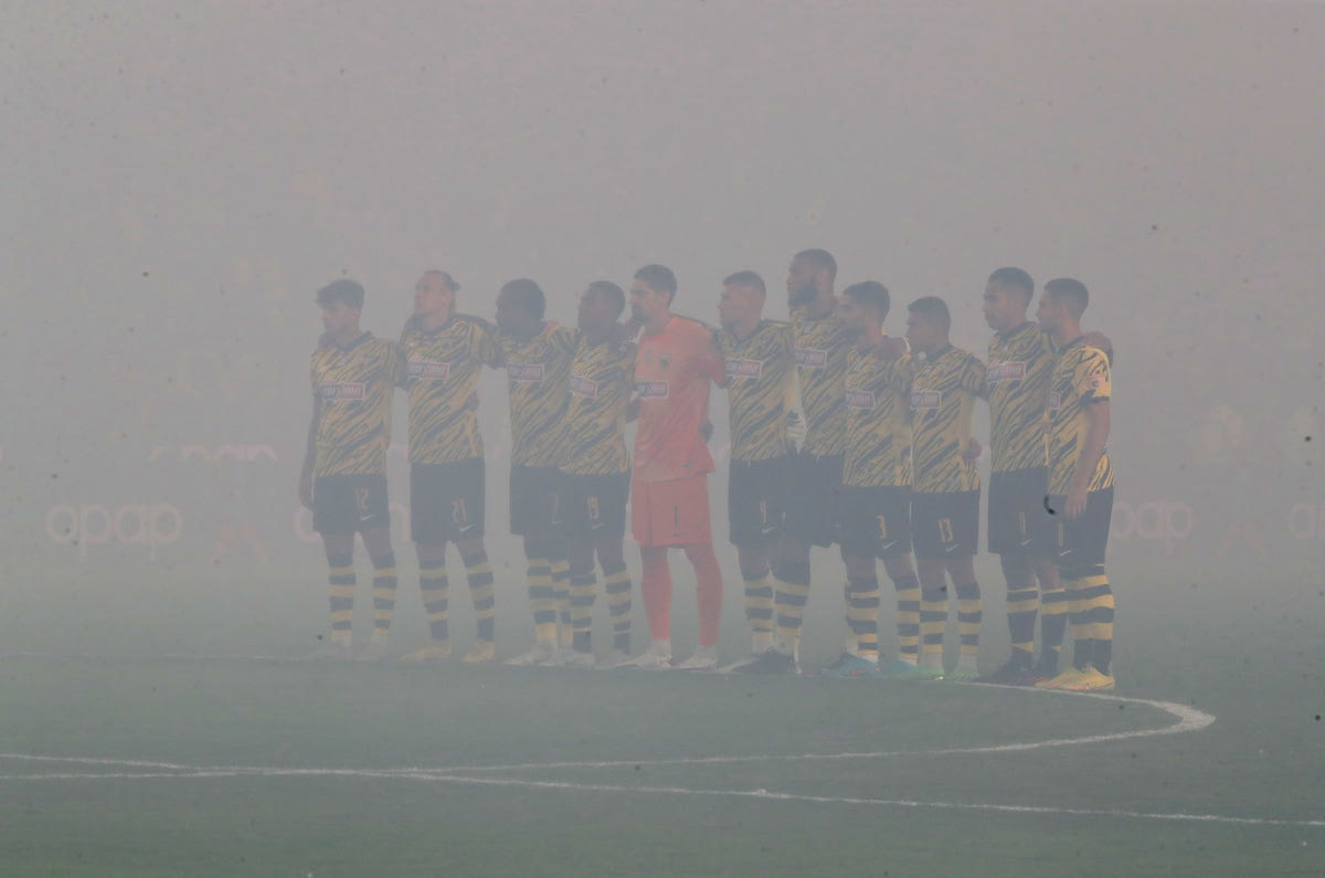 Η καθυστέρηση αυτή έγινε εξαιτίας των καπνογόνων που έκαναν τη νύχτα μέρα και δημιούργησαν πρόβλημα τόσο στην ορατότητα των ποδοσφαιριστών όσο και στη σωστή χρήση του VAR.