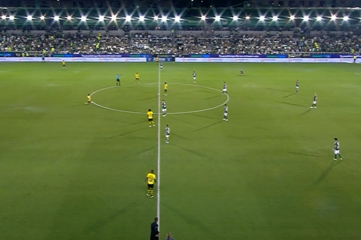 Οι ποδοσφαιριστές της ΑΕΚ επέστρεψαν στον αγωνιστικό χώρο, αφού κατέβηκε το πανό οπαδών του Παναθηναϊκού υπέρ των BBB και έτσι το ματς ξεκίνησε.