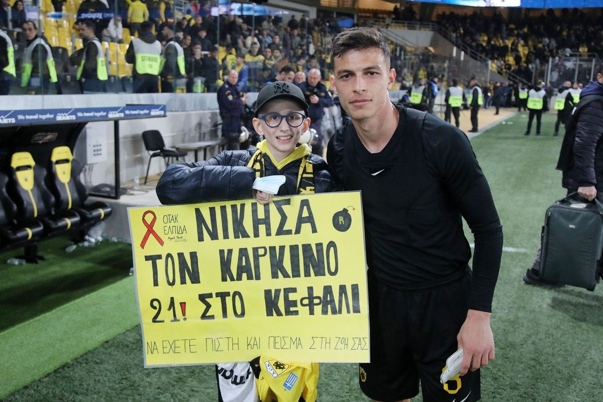 Ο μικρός φίλος της ΑΕΚ, Μιχαήλ Πάνος, συγκίνησε με την παρουσία του στην εκπομπή Monday FC, ειδικότερα για τον λόγο που έγραψε αυτό το πλακάτ. Ο νεαρός φίλαθλος της Ένωσης ήθελε να δώσει δύναμη στα παιδιά που δίνουν μάχη με τη ζωή τους όπως έδωσε κι εκείνος.