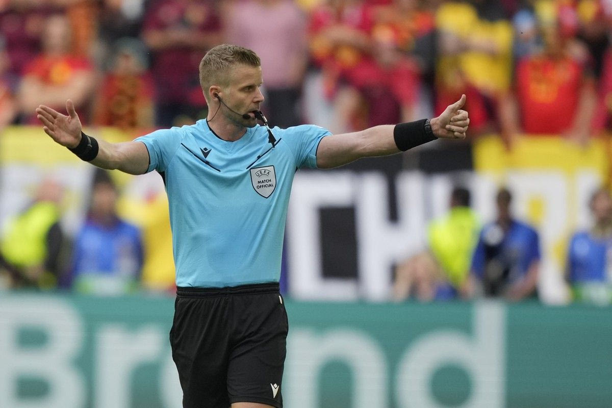 Referee Glenn Nyberg gestures during a round of sixteen match between France and Belgium at the Euro 2024 soccer tournament in Duesseldorf, Germany, Monday, July 1, 2024. (AP Photo/Martin Meissner)