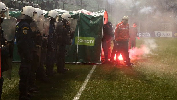 Στην αναγνωριστική βόλτα από τους τερματοφύλακες του Ολυμπιακού έπεσαν φωτοβολίδες. Λίγο αργότερα μπήκαν στο γήπεδο οπαδοί του Παναθηναϊκού και η κατάσταση ήταν ανεξέλεγκτη. Έπεσε ξύλο με τα ΜΑΤ και οι παίκτες του Ολυμπιακού έτρεξαν για τα αποδυτήρια.
