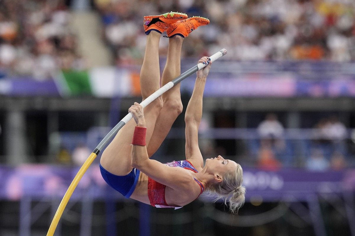 Katie Moon, of the United States, competes in the women's pole vault final at the 2024 Summer Olympics, Wednesday, Aug. 7, 2024, in Saint-Denis, France. (AP Photo/Rebecca Blackwell)