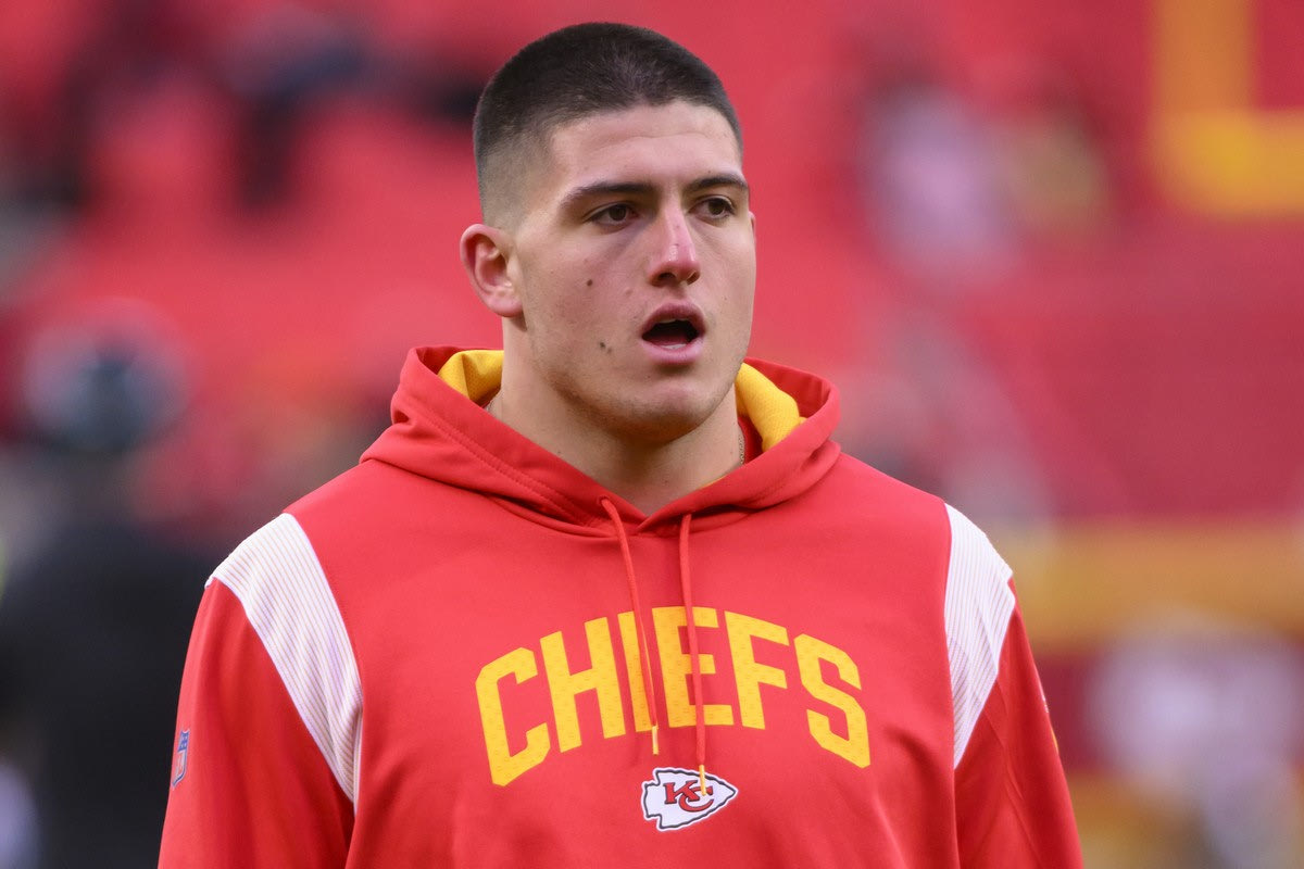 Kansas City Chiefs defensive end George Karlaftis during warmups before an NFL divisional round playoff football game against the Jacksonville Jaguars, Saturday, Jan. 21, 2023 in Kansas City, Mo. (AP Photo/Reed Hoffmann)
