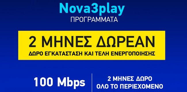 2 μήνες δωρεάν το πάγιο σε όλες τις υπηρεσίες Nova3play και Nova2play με Internet 100Mbps, καθώς και στις υπηρεσίες Τηλεόρασης