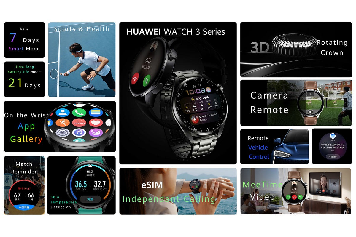 Η σειρά HUAWEI WATCH 3 είναι ένας επαγγελματίας σύμβουλος φυσικής κατάστασης και υγείας που υποστηρίζει έως και 100 τύπους προπόνησης. Εξοπλισμένο με έναν νέο αισθητήρα υψηλής ακρίβειας, το ρολόι ανιχνεύει τη θερμοκρασίας σώματος, κάτι που γίνεται πρώτη φορά. Ανιχνεύει επίσης τα επίπεδα γλυκόζης στο αίμα, αντιδρά σε περίπτωση πτώσης ή εκπομπής σήματος SOS και μπορείτε να το χρησιμοποιείτε για να παρακολουθείτε και να διαχειρίζεστε την υγεία σας σε πραγματικό χρόνο. Μπορείτε επίσης να το χρησιμοποιείτε για να υπενθυμίζετε στον εαυτό σας μικροπράγματα που είναι εύκολο να ξεχαστούν, όπως πότε να πιείτε νερό ή να πάρετε το φάρμακό σας.