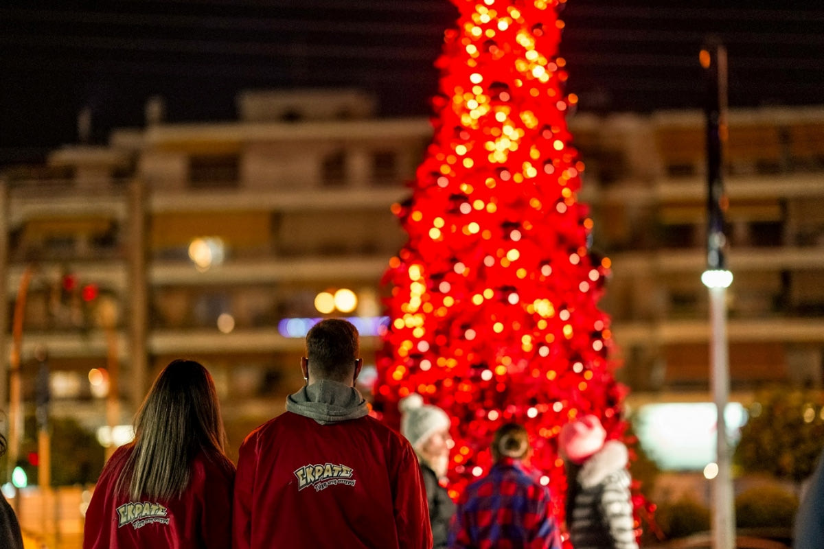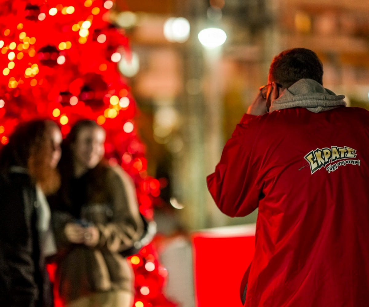 Χριστουγεννιάτικα κλικ κάτω από το κατακόκκινο δέντρο του ΣΚΡΑΤΣ στο Γαλάτσι – Εορταστικό χρώμα στην πλατεία Μανδηλαρά