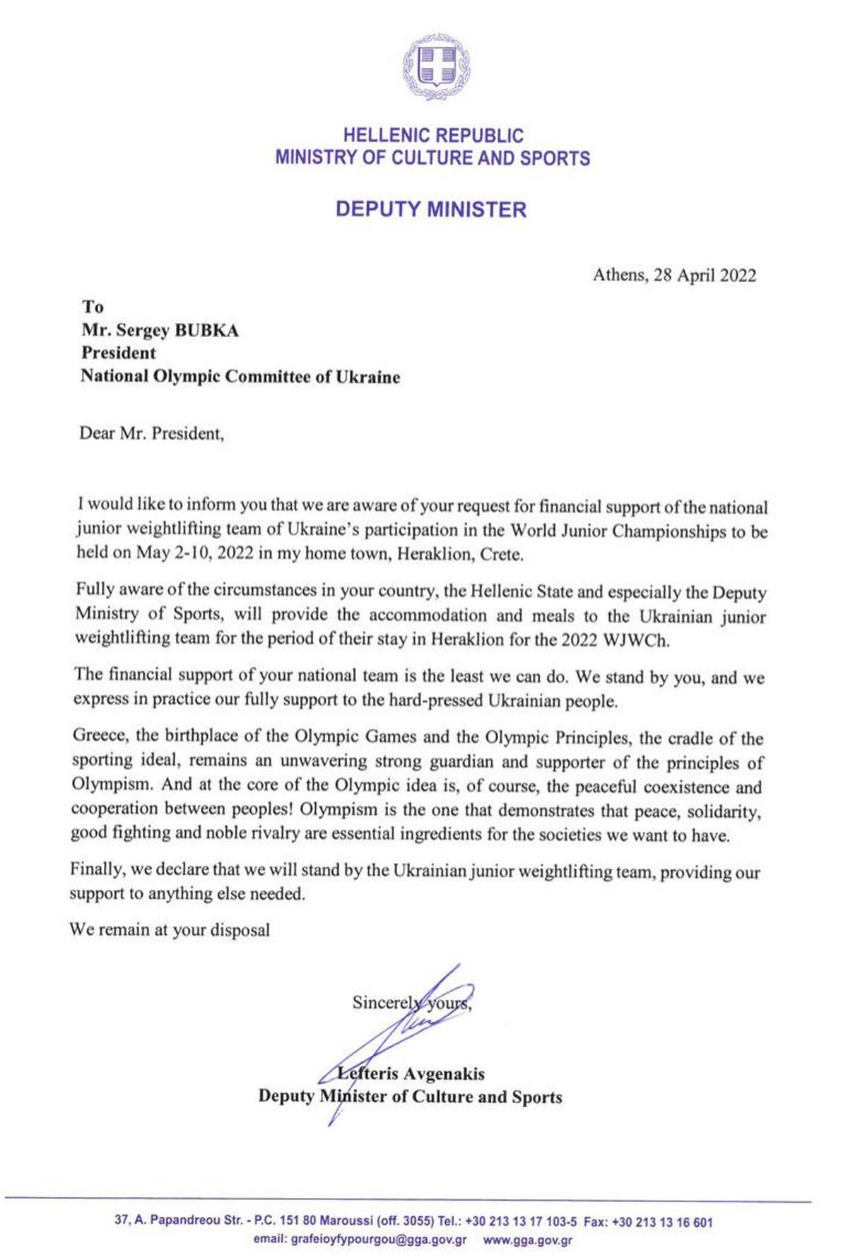 «Αγαπητέ πρόεδρε, Sergey Bubka, Θα ήθελα να σας ενημερώσω ότι λάβαμε γνώση του αιτήματός σας για οικονομική στήριξη της Ουκρανικής αποστολής η οποία θα συμμετάσχει στο Παγκόσμιο Πρωτάθλημα Άρσης Βαρών Εφήβων – Νεανίδων, που θα διεξαχθεί από 2-10 Μαΐου 2022 στην ιδιαίτερη πατρίδα μου, στο Ηράκλειο Κρήτης.
