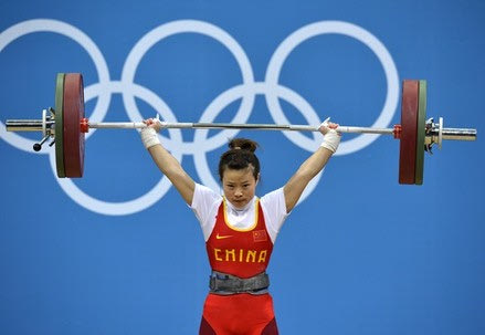China's Wang Mingjuan lifts during the women's 48kg group A weightlifting competition at The Excel Centre in London on July 28, 2012, during the 2012 Olympic Games. AFP PHOTO / YURI CORTEZ (Photo credit should read YURI CORTEZ/AFP/GettyImages)