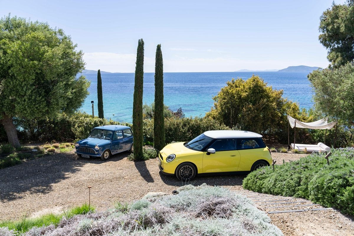 Το αμιγώς ηλεκτρικό MINI Cooper E εντυπωσιάζει με το αναζωογονητικό εξωτερικό χρώμα Sunny Side Yellow, ενώ η σπορ, μοντέρνα εμφάνισή του ταιριάζει απόλυτα με το ελληνικό μεσογειακό τοπίο.