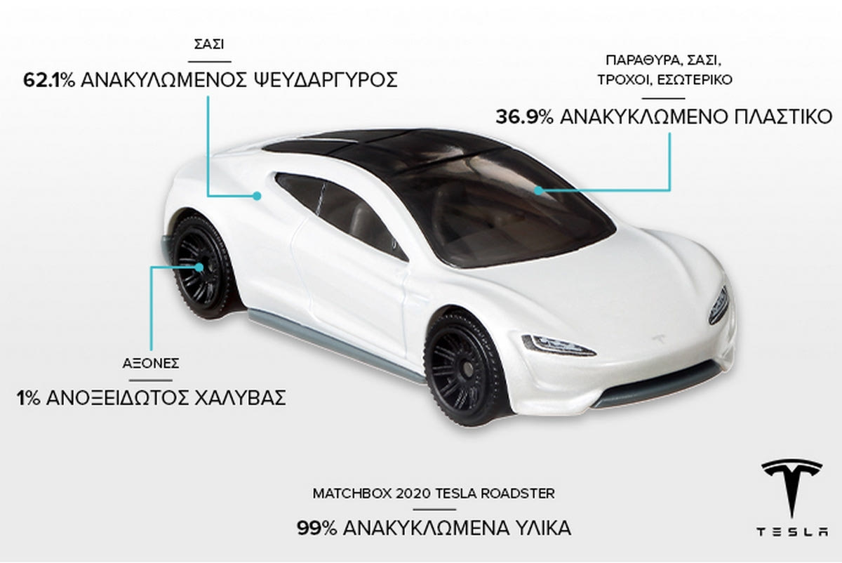 Προς αυτή τη κατεύθυνση, το πρώτο εγχείρημα είναι το Matchbox Tesla Roadster, το πρώτο αυτοκινητάκι κατασκευασμένο από 99% ανακυκλωμένα υλικά και πιστοποιημένο ως Carbon Neutral (ουδέτερο ισοζύγιο άνθρακα). Κατασκευασμένο από 62,1% ανακυκλωμένο ψευδάργυρο, 1% ανοξείδωτο χάλυβα και 36,9% ανακυκλωμένο πλαστικό, το Matchbox Tesla Roadster θα είναι διαθέσιμο από το 2022.