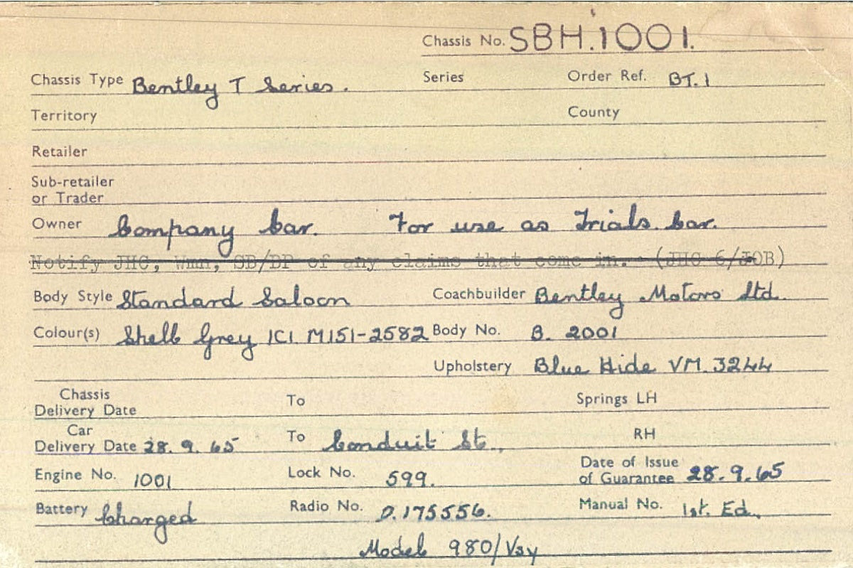 Το συγκεκριμένο αυτοκίνητο βγήκε από την γραμμή παραγωγής στις 28 Σεπτεμβρίου 1965, με εξωτερική βαφή Shell Grey και μπλε δερμάτινο εσωτερικό. Ανήκε φυσικά στην Bentley Motors και προορισμός της ήταν οι δοκιμές σε όλο τον κόσμο.