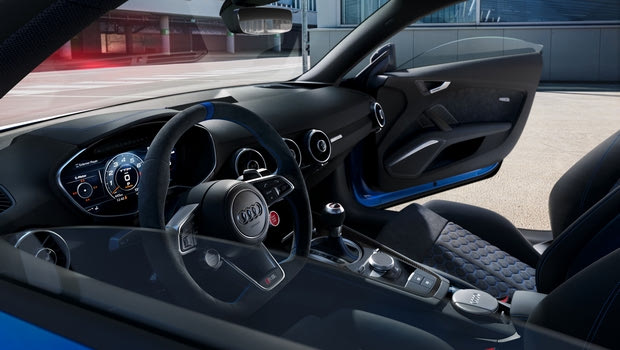 Το εσωτερικό είναι επίσης εμπνευσμένο από το θρυλικό RS 2: Κυριαρχείται από το μαύρο χρώμα, με μπλε χρώματα κοβαλτίου στο σαλόνι από Alcantara, τα πατάκια δαπέδου και το τιμόνι. Τα RS σπορ καθίσματα με κυψελοειδές μοτίβο στα μοντέλα TT RS, RS 4 και RS 5, συνδυάζουν εξαιρετικό δέρμα Nappa με Alcantara, όπως και το RS 2 Avant. Η ταπετσαρία καθισμάτων των RS θέσεων σπορ στο RS 6 και RS 7 έχει σχεδιαστεί σε διάτρητο δέρμα Valcona. Στο εσωτερικό, το λογότυπο “25 ετών” διακοσμεί την περιοχή των ώμων των καθισμάτων, τα πατάκια και τα καλύμματα πόρτας.