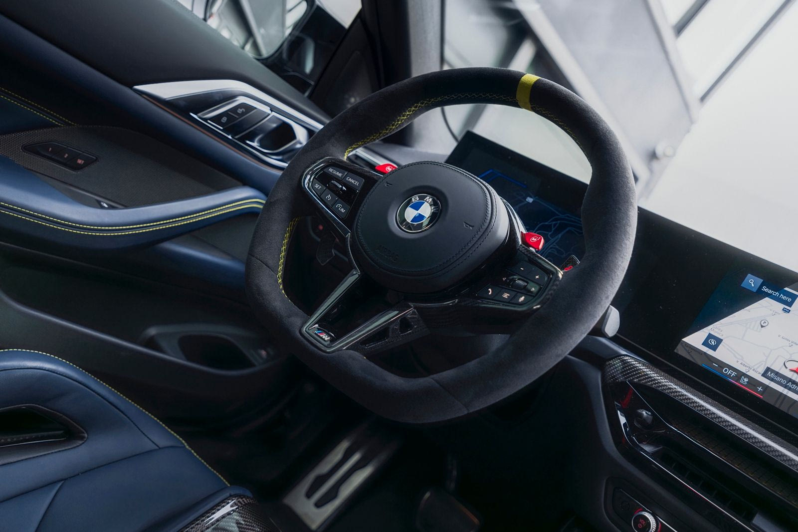 Η οροφή από ανθρακονήματα – όπως και τα βαμμένα στο χέρι πλαϊνά του αυτοκινήτου – κοσμείται με ένα μεγάλο λογότυπο VR46 (επίσης σε κίτρινο χρώμα) και την υπογραφή του Rossi. Στην πίσω πόρτα υπάρχει η επιγραφή VR46. Οι κίτρινες λεπτομέρειες απαντώνται και στο εσωτερικό της BMW M4 CS Edition VR46, που έχει ως βασικό χρώμα το Night Blue. Τα μπάκετ καθίσματα M Carbon είναι επενδεδυμένα με δέρμα Merino σε χρωματικό συνδυασμό Black/Night Blue. Η απόχρωση Sao Paulo Yellow στην περιοχή των ώμων, η οποία φέρει επένδυση Alcantara, προσφέρει μια μοναδική αντίθεση.