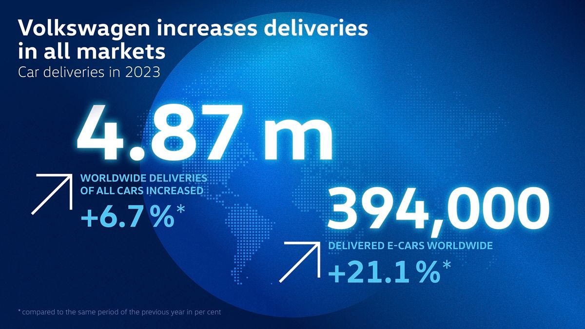 Οι αριθμοί αυτοί ξεπέρασαν τις πωλήσεις του προηγούμενου έτους σε όλες τις περιοχές που δραστηριοποιείται η εταιρεία. Συνολικά, η αύξηση των παραδόσεων ήταν 6,7%. Επίσης, αύξηση σημείωσε και η ζήτηση για ηλεκτρική κινητικότητα. Η Volkswagen παρέδωσε περίπου 394.000 πλήρως ηλεκτρικά οχήματα σε πελάτες της σε όλο τον κόσμο το 2023, γεγονός που αντιστοιχεί σε αύξηση 21,1% σε σύγκριση με το προηγούμενο έτος.