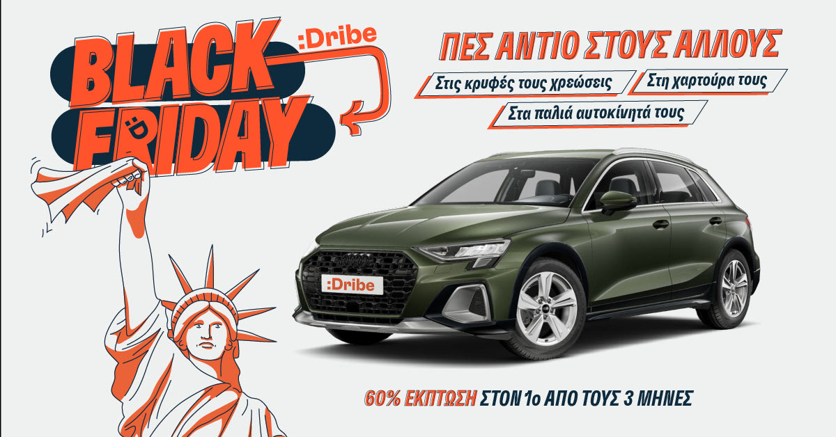 Αυτή τη Black Friday, προσφέρεται για να εξερευνήσει κάθε ενδιαφερόμενος έναν νέο, ευέλικτο τρόπο μετακίνησης με 60% έκπτωση στο πρώτο μηνιαίο μίσθωμα για κάθε τρίμηνη συνδρομή. Αυτό σημαίνει στην πράξη, αυτοκίνητο χωρίς δεσμεύσεις και χωρίς να χρειάζεται να ανοίξει κανείς το πορτοφόλι του. Όλα γίνονται μέσω του κινητού τηλεφώνου με την εφαρμογή της :Dribe, που σημαίνει πως όλα γίνονται εύκολα, γρήγορα και χωρίς “ψιλά γράμματα”.