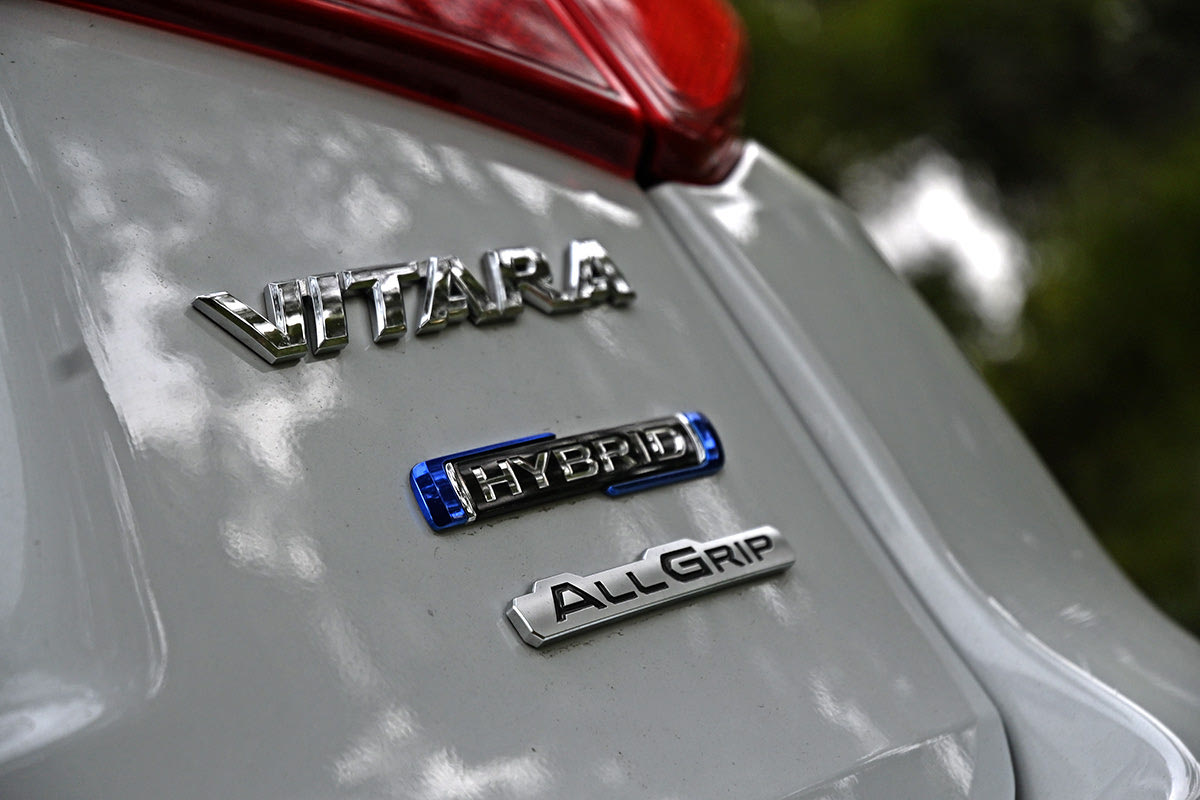 Η πλήρως υβριδική έκδοση του Vitara δεν έχει σχεδόν καμία σχεδιαστική αλλαγή από τις mild hybrid. Μπορεί να την εντοπίσει κανείς μόνο από το σήμα Hybrid κάτω από το πίσω δεξί φως, που συμπληρώνεται από την ένδειξη AllGrip στην τετρακίνητη παραλλαγή του.