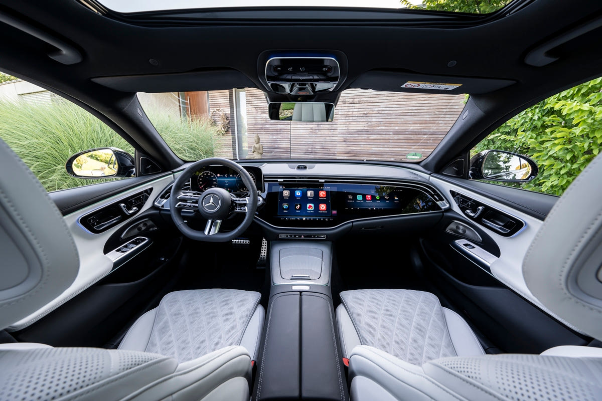 Αντίστοιχα, στο εσωτερικό, ο πίνακας οργάνων είναι η επιτομή της ψηφιακής εμπειρίας. Εάν η E-Class διαθέτει την προαιρετική οθόνη συνοδηγού, η μεγάλη γυάλινη επιφάνεια της MBUX Superscreen επεκτείνεται έως την κεντρική οθόνη. Οπτικά αποκομμένη από αυτή ξεχωρίζει η οθόνη οδηγού που βρίσκεται στο οπτικό του πεδίο.