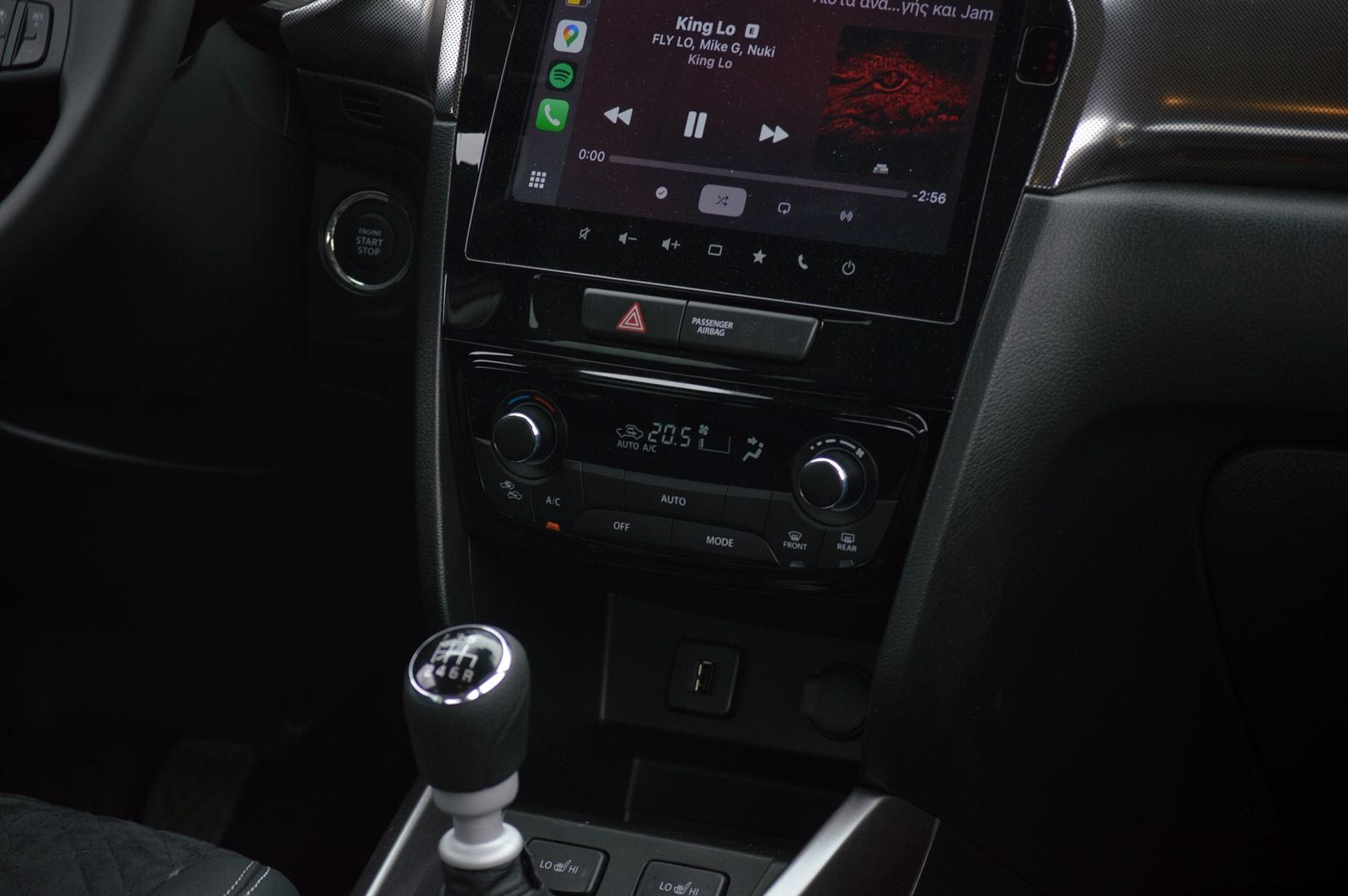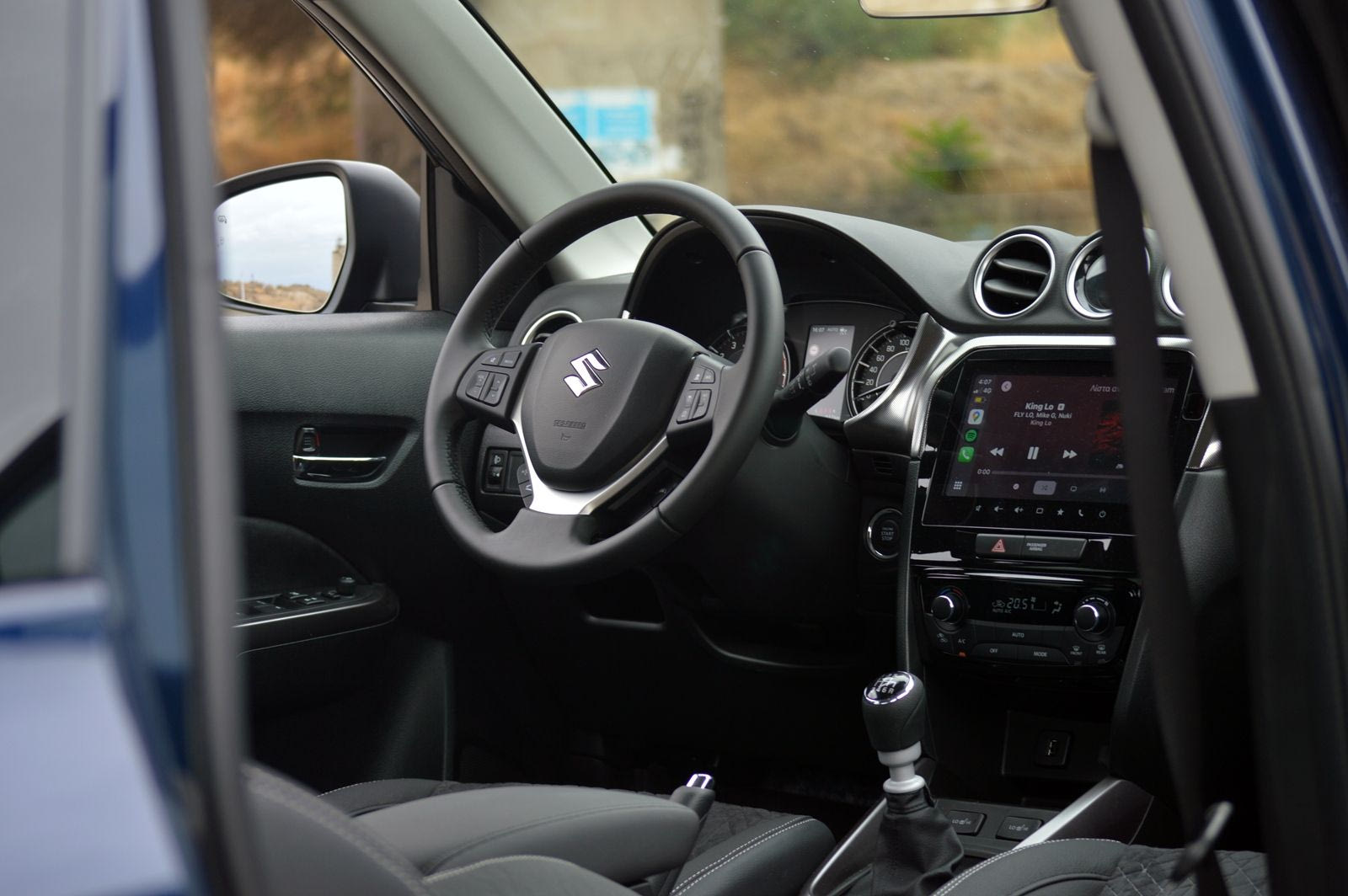 Το εσωτερικό παραμένει χαρακτηριστικό Suzuki, με καθαρές επιφάνειες, λειτουργικό στα όρια του κυνικού χωρίς “φανφάρες” και περιττές ηλεκτρονικές φιοριτούρες. Ο πίνακας οργάνων με τις δύο αναλογικές ενδείξεις είναι ίσως παλιομοδίτικος αλλά ευανάγνωστος. Η κεντρική οθόνη των 9 ιντσών έχει όλα τα απαραίτητα και υποστηρίζει Android Auto, Apple CarPlay, ενώ προβάλει και τις εικόνες από την κάμερα οπισθοπορείας. Τα καθίσματα είναι άνετα, με σωστή στήριξη, και οι χώροι πίσω επαρκούν άνετα για δύο ενήλικες και παιδί.