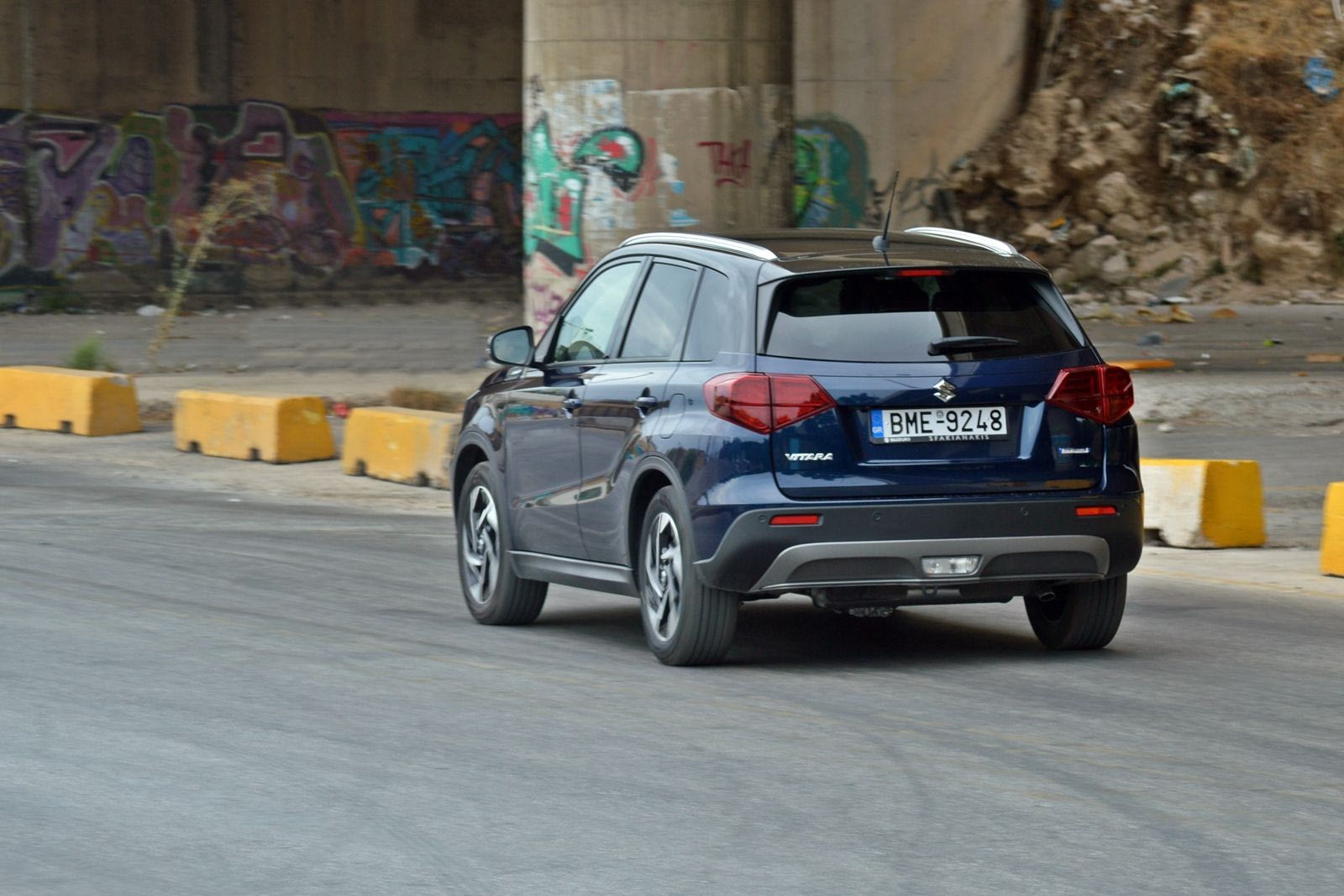 Στον δρόμο, η ανάρτηση είναι σφιχτή όσο πρέπει, χωρίς να κουράζει. Το αυτοκίνητο στρίβει ουδέτερα, με μικρές σχετικά κλίσεις και γρήγορη απόκριση από το τιμόνι. Δεν είναι σπορ και στο δείχνει από τα πρώτα κιόλας μέτρα που κάνεις μαζί του αλλά έχει αυτό το γνώριμο ιαπωνικό feedback. Νιώθεις τι κάνουν οι τροχοί, πώς “πατάει” το αυτοκίνητο και που φτάνουν τα όρια της πρόσφυσης. Το μικρό απόβαρο στα 1.325 κιλά βοηθάει πολύ, μαι και το Vitara είναι ελαφρύτερο από τους περισσότερους ανταγωνιστές του κι αυτό το αισθάνεσαι σε κάθε αλλαγή κατεύθυνσης.