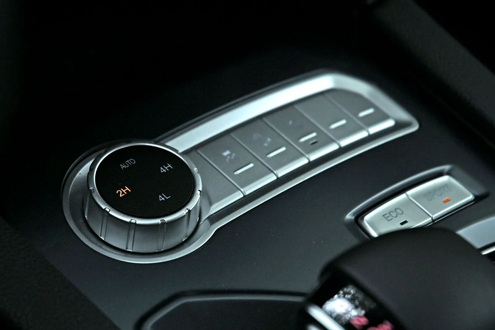Η μετάδοση συνδυάζεται με σύστημα τετρακίνησης BorgWarner part-time, με επιλογές 2H, AUTO, 4H και 4L. Το AUTO mode έχει ιδιαίτερο ενδιαφέρον γιατί μεταβάλλει αυτόματα την κατανομή ροπής μεταξύ εμπρός και πίσω άξονα, κάτι που δεν είναι δεδομένο σε παραδοσιακά pickups. Στην πράξη, αυτό σημαίνει ότι στην άσφαλτο έχεις πιο ασφαλή και ομαλή συμπεριφορά, ενώ στο χώμα μπορείς να κλειδώσεις την τετρακίνηση και να πας “όπως παλιά”.