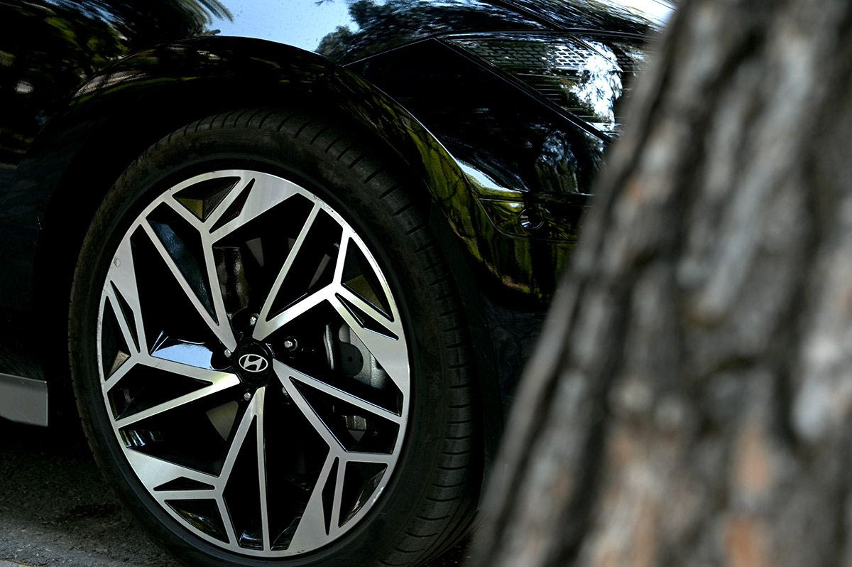 Τα πάντα στο σχεδιασμό του Ioniq 6 εξυπηρετούν την αεροδυναμική: τα ενεργά (ηλεκτρικά κινούμενα) πτερύγια στο κάτω μέρος του προφυλακτήρα, οι αεροκουρτίζες στους θόλους που ελέγχουν τους στροβιλισμούς, το σχέδιο των ζαντών, και φυσικά το επίπεδο κάτω μέρος του δαπέδου που στέλνει τη ροή του αέρα κατ’ ευθείαν στο διαχύτη, στην απόληξη του δαπέδου.