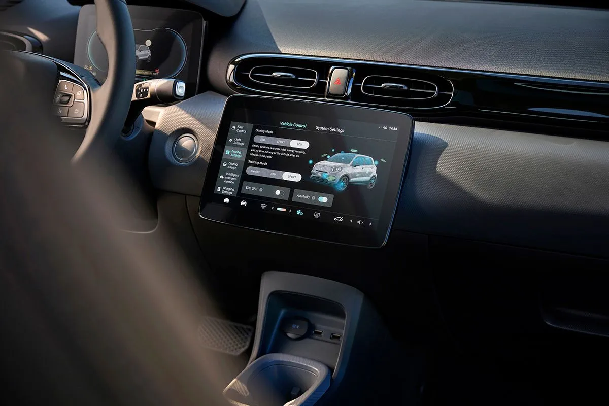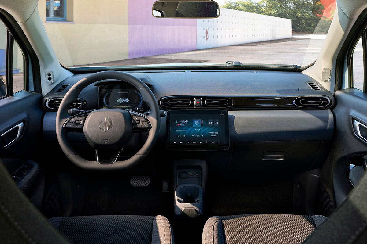 Η κεντρική οθόνη αφής 10,1 ιντσών για τα πολυμέσα, τη συνδεσιμότητα και την πλοήγηση βρίσκεται -ασυνήθιστα- χαμηλά στο κέντρο του ταμπλό, κάτω από την κεντρική γραμμή των αεραγωγών. Αριστερά της, πίσω από το τιμόνι, ο ψηφιακός πίνακας οργάνων έχει διαγώνιο 8 ιντσών, με αρκετά καλαίσθητα γραφικά.