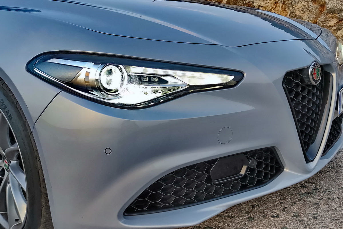 Την ίδια στιγμή ξεχωρίζει με το επίκαιρο μα και διαχρονικό της ντιζάιν. Ο θυρεός που δεσπόζει στο εμπρός μέρος σε κάθε Alfa Romeo κάνει ξεκάθαρη την ταυτότητα του σπορ σεντάν, με τους μεγάλους αεραγωγούς εκατέρωθεν και τα χαρακτηριστικά αμυγδαλωτά φώτα να διαμορφώνουν μια άκρως δυναμική όψη εμπρός.