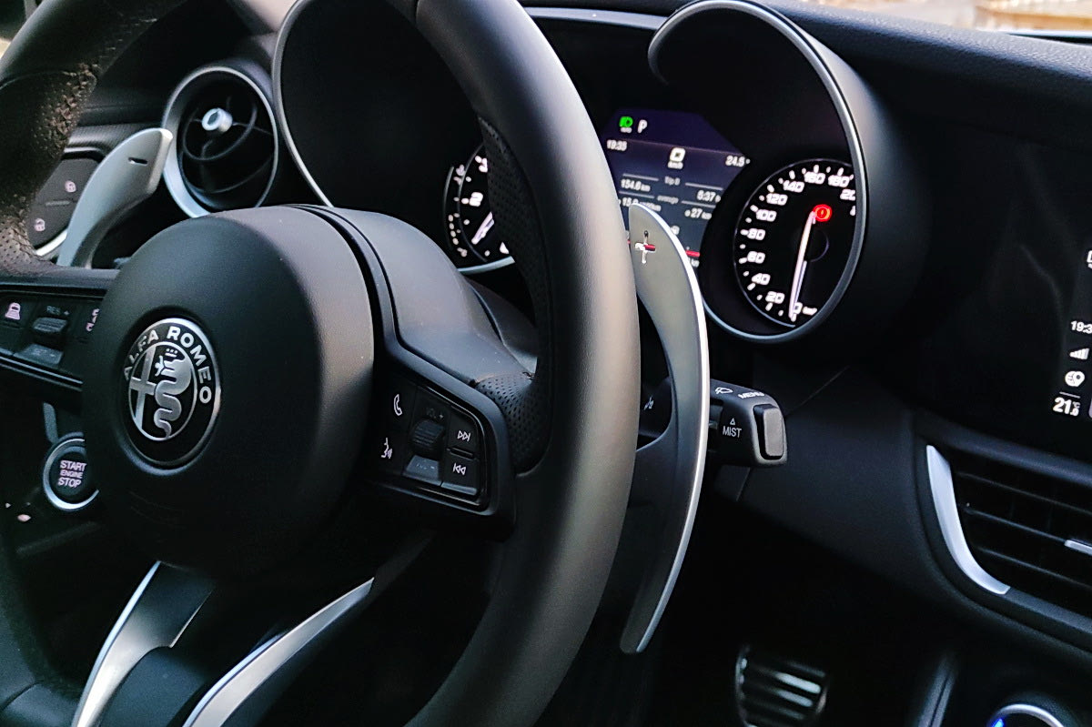 Ο χειριστής του ιταλικού σεντάν έχει εμπρός του ένα πανέμορφο τιμόνι με το start button κάτω από το αριστερό μπράτσο και τα μεγάλα, πανέμορφα μεταλλικά paddles για τις αλλαγές σχέσεων, σταθερά στο πίσω μέρος.