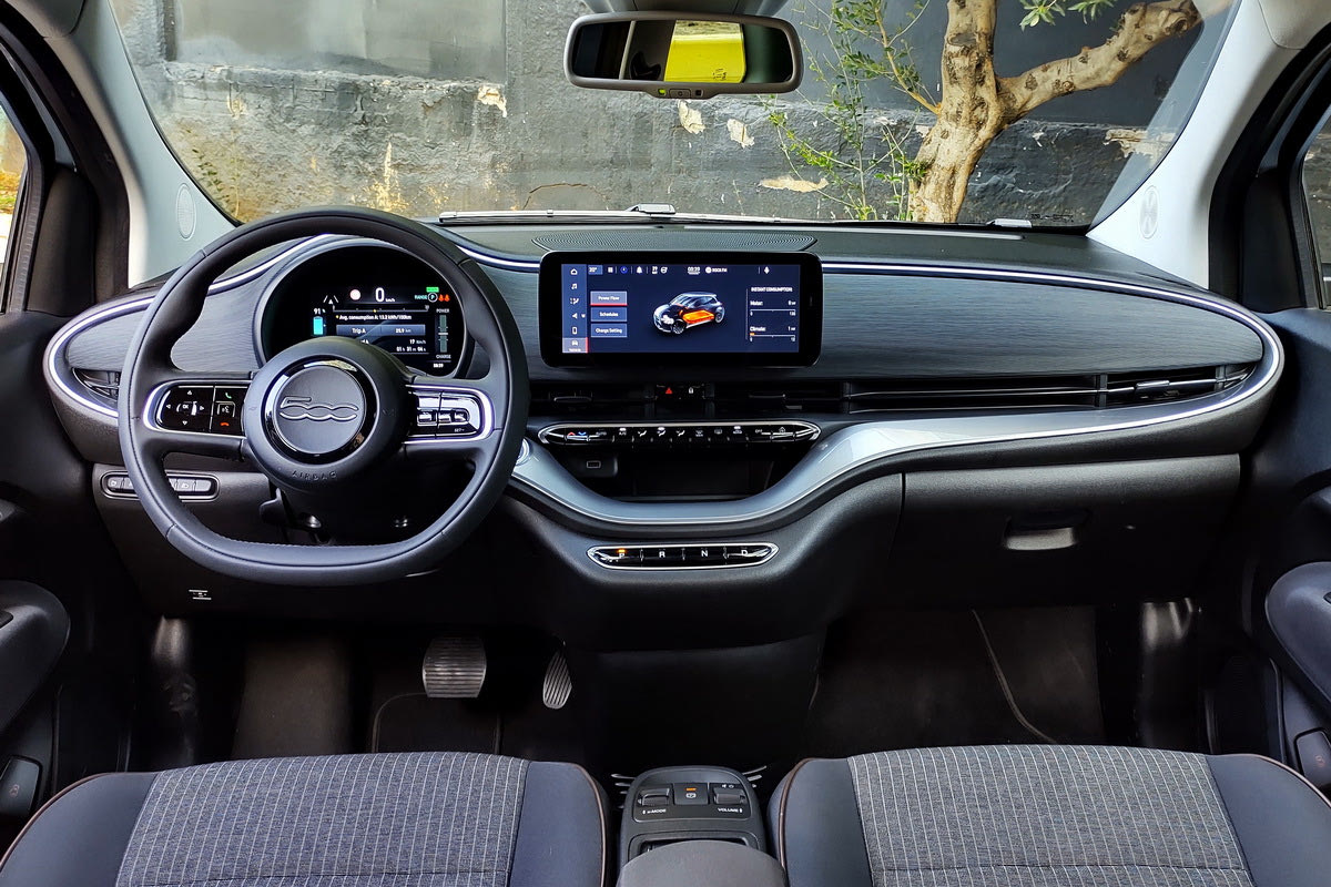 Το εσωτερικό είναι πανομοιότυπο με τις άλλες εκδόσεις του FIAT 500e – και αυτό μόνο θετικό μπορεί να χαρακτηριστεί. Κυριαρχούν η πανέμορφη και λιτή αισθητική, τα ποιοτικά πλαστικά και υφασμάτινες επενδύσεις, αλλά και οι δύο οθόνες στο ταμπλό: ο ψηφιακός πίνακας οργάνων 7’’ που διακρίνεται για την πληθώρα ενδείξεων και η οθόνη αφής του συστήματος πολυμέσων UConnect 5ης γενιάς των 10,25’’.