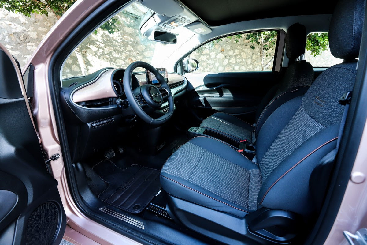 Γενικά, η καμπίνα του 500e φτιάχνει τη διάθεση, τόσο με τη σχεδίαση, τους συνδυασμούς χρωμάτων και επενδύσεων και την τεχνολογία που ενσωματώνει, αλλά και με έξυπνα στοιχεία όπως π.χ. ο χώρος ανάμεσα στο ταμπλό και την κονσόλα που επιτρέπει το εύκολο πέρασμα από τη μία θέση στην άλλη, ή οι πόρτες που ανοίγουν ηλεκτρικά με το πάτημα ενός κουμπιού – εναλλακτικά μέσω ενός μοχλού που βρίσκεται χαμηλότερα.