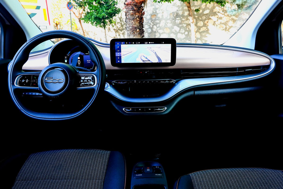 Ιδιαίτερα όμορφο είναι και το εσωτερικό του ηλεκτρικού 500. Εδώ ο ψηφιακός φουτουρισμός κυριαρχεί της ρετρό εμφάνισης, χάρη κυρίως στις δύο οθόνες. Η μία (7’’) έχει αντικαταστήσει τον πίνακα οργάνων και διακρίνεται για την πληθώρα ενδείξεων, ενώ η δεύτερη (7’’ ή 10,25’’) βρίσκεται στο κέντρο του ταμπλό και φιλοξενεί το σύστημα ενημέρωσης και ψυχαγωγίας UConnect 5ης γενιάς.