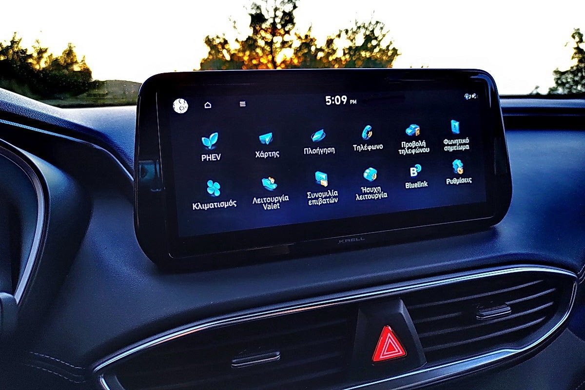 Στο κέντρο του ταμπλό αιωρείται η οθόνη αφής 10,25’’ του infotainment (8’’ στην έκδοση Premium). Περιλαμβάνει σύστημα πλοήγησης, απεικόνιση της εικόνας περιμετρικά του οχήματος από τις κάμερες 360 μοιρών και τις τηλεματικές υπηρεσίες Hyundai BlueLink (δωρεάν 5-ετής συνδρομή) για εξ αποστάσεως σύνδεση με smartphone για έλεγχο λειτουργιών, ειδοποιήσεις, ενσωμάτωση ημερολογίου Google/iCloud κλπ.
