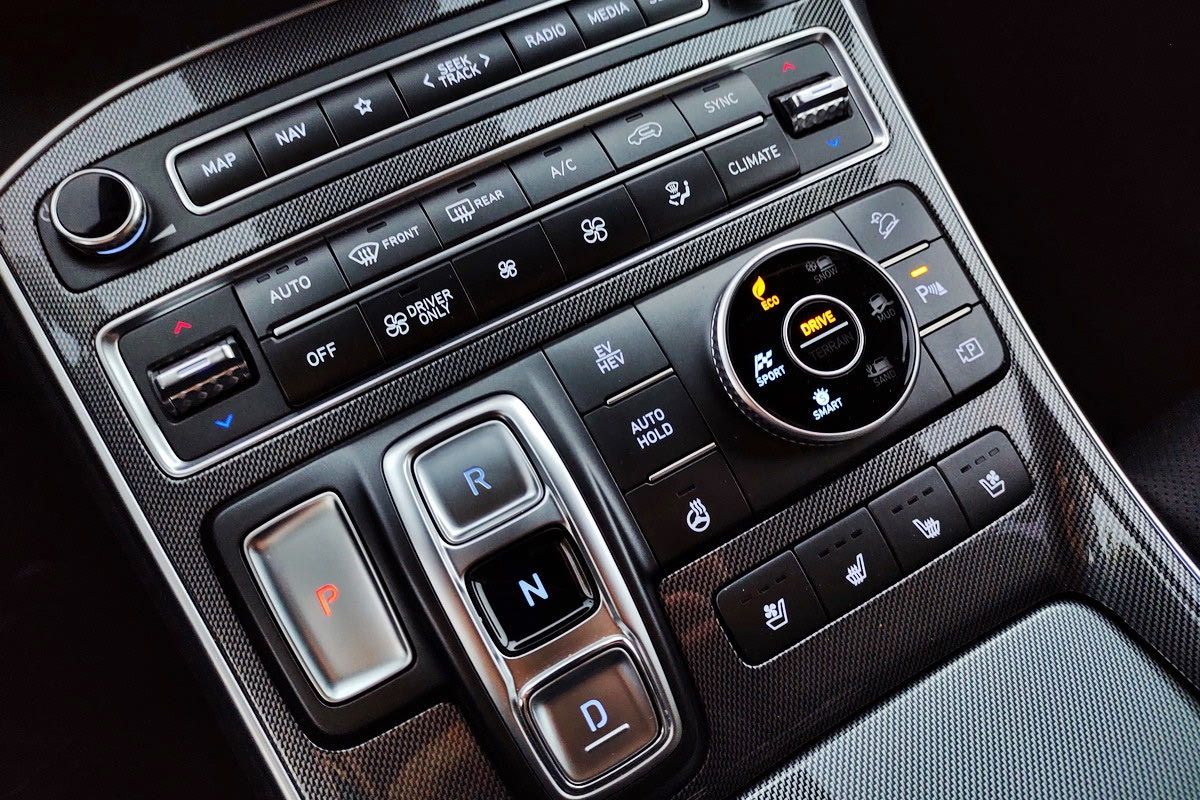 Λίγο πιο κάτω, υπάρχουν διακόπτες επιλογής της κίνησης (R, N, D και P) αντί του κλασικού λεβιέ για το αυτόματο κιβώτιο ταχυτήτων – φυσικά υπάρχει και η δυνατότητα χειροκίνητων αλλαγών σχέσεων με τα χειριστήρια +/- στο τιμόνι.