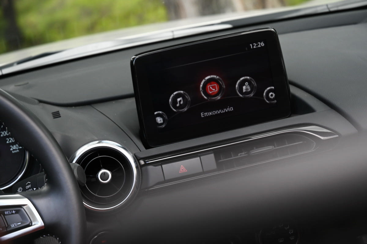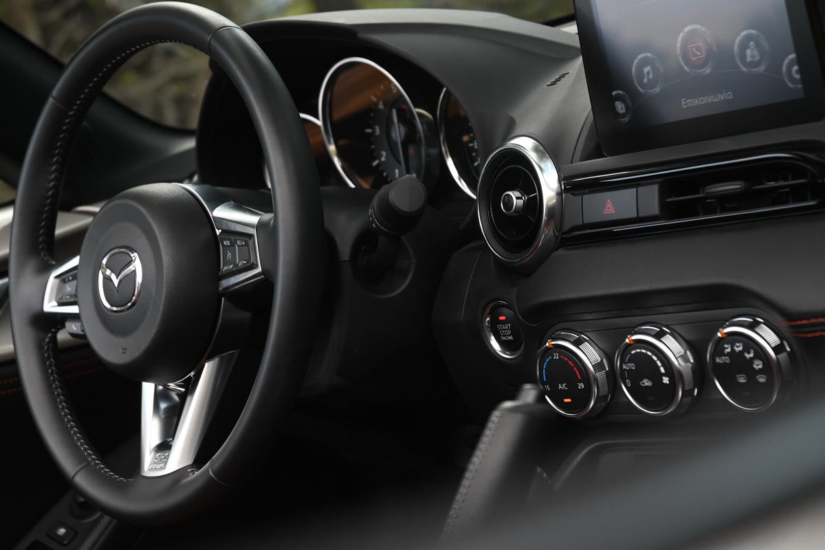 Η εφαρμογή της είναι άριστη, χαρακτηρισμός που ταιριάζει γενικότερα στην συναρμογή των ποιοτικών υλικών που συνθέτουν το εσωτερικό του MX-5. Κατά τα λοιπά, οι θήκες για μικροαντικείμενα περιορίζονται σε ένα… κουτάκι δίπλα στο χειρόφρενο και ένα ντουλαπάκι πίσω, ανάμεσα στα καθίσματα.