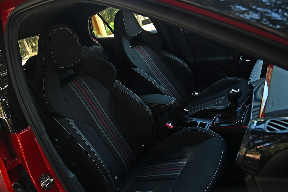 Την ίδια αύρα αποπνέει και το εσωτερικό του Fabia Monte Carlo, κατά κύριο λόγο από τα τύπου μπάκετ καθίσματα που προσφέρουν εξαιρετική πλευρική στήριξη και θυμίζουν αγωνιστικά στο σχέδιό τους. Και επίσης, από το τιμόνι με διάτρητο δέρμα και οριζόντιο κάτω μέρος (flat-bottom), από τις τύπου ανθρακονημάτων επενδύσεις και από τις κόκκινες και μαύρες γυαλιστερές λεπτομέρειες.
