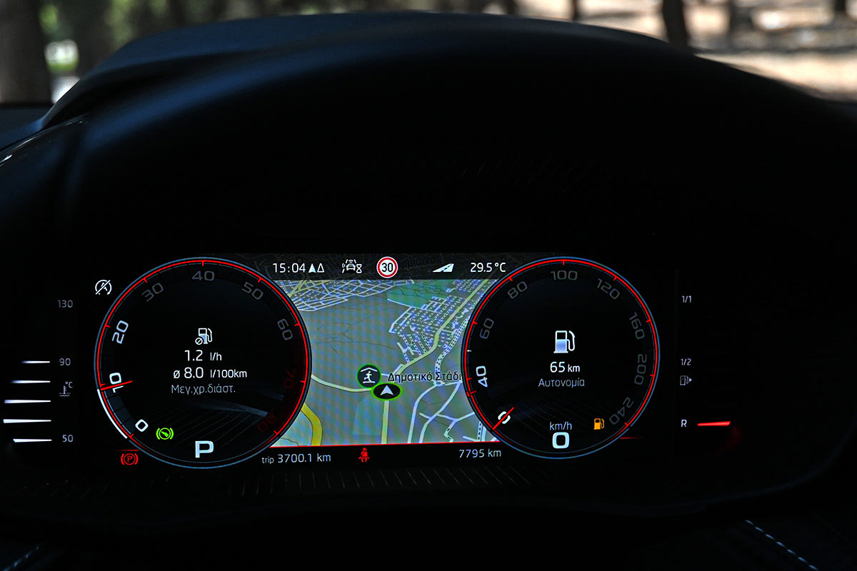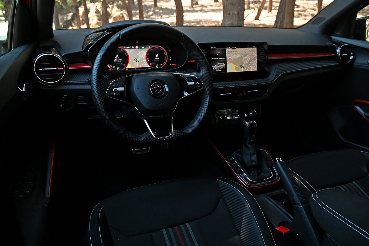Η Skoda καθιστά σαφή την επιλογή της να κρατήσει -ακόμα και σε αυτή την πιο δυναμική έκδοση του Fabia- την καθημερινή άνεση, που είναι διάχυτη σε κάθε πτυχή του αυτοκινήτου. Αρχικά από τις ανέσεις του εσωτερικού, που περιλαμβάνουν δύο ψηφιακές οθόνες -για τον πίνακα οργάνων και για τα πολυμέσα στο κέντρο του ταμπλό. Η δεύτερη προσφέρει φυσικά πλήρη συνδεσιμότητα με το smartphone, αλλά παράλληλα απεικονίζει και την επιλογή των οδηγικών προφίλ Eco, Normal, Sport ή Individual.