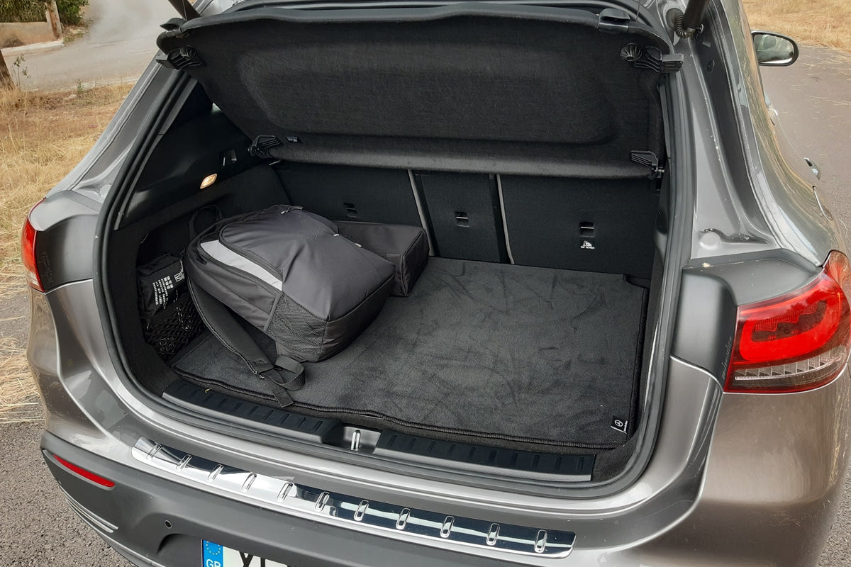 Πιο πίσω, ο χώρος αποσκευών μοιάζει να έχει αρκετά ψηλά τοποθετημένο το πάτωμά του, ορίζοντας ένα κανονικό σε σχήμα χώρο, του οποίου η χωρητικότητα εξαντλείται στα 340 λίτρα. Φυσικά υπάρχει και η δυνατότητα αναδίπλωσης της πλάτης του πίσω καθίσματος σε δύο τμήματα, προκειμένου η μεταφορική ικανότητα της EQA να φτάσει έως και τα 1.320 λίτρα (σε διθέσια διαμόρφωση).