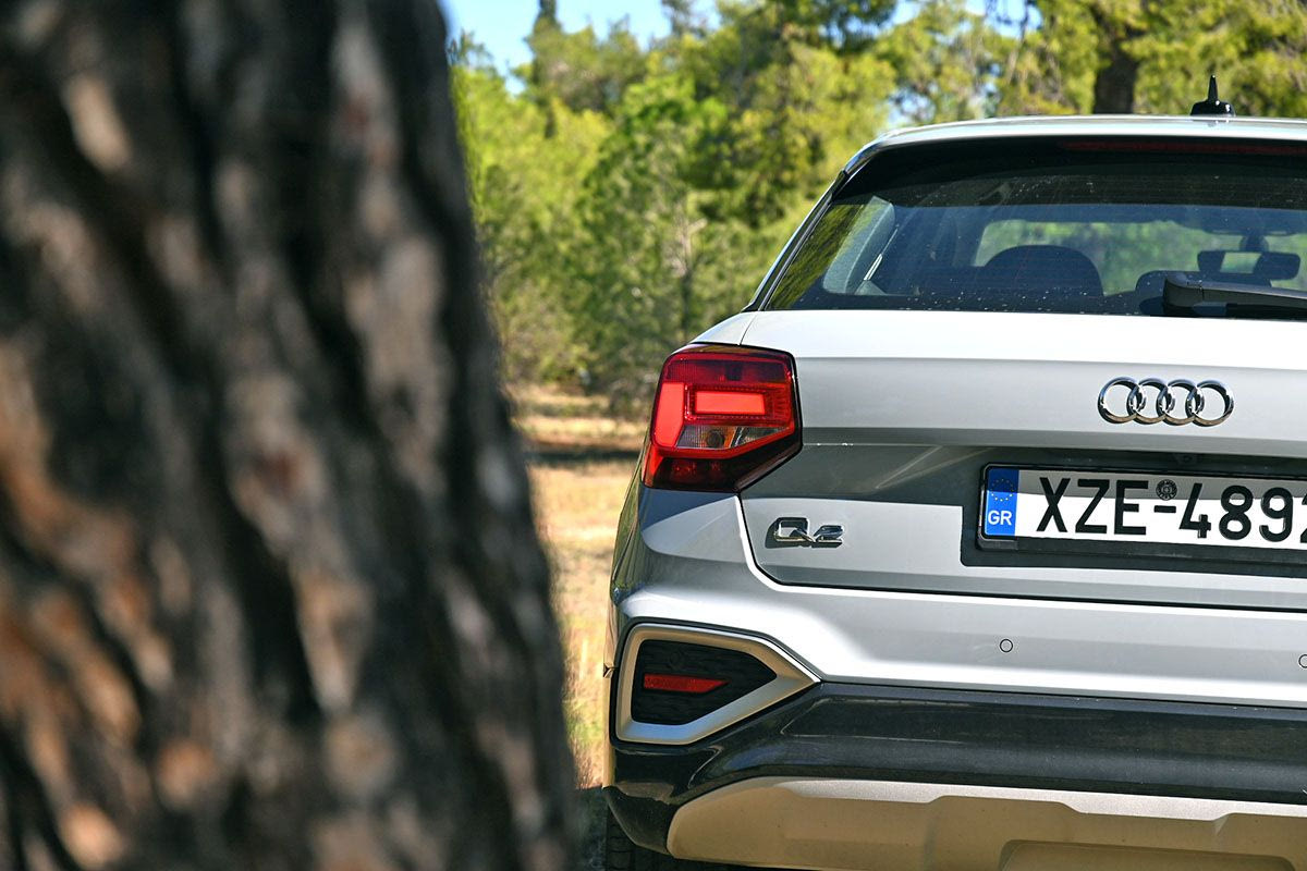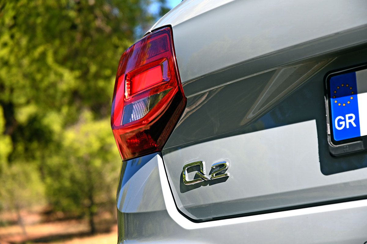 Μια από τις αισθητικές καινοτομίες του Q2 εξ αρχής ήταν η ιδιαίτερη διαχείριση της πίσω κολόνας, η οποία με το μαύρο της γυαλιστερό χρώμα συνεχίζει τη μαύρη φιμέ περίμετρο των πλευρικών και πίσω τζαμιών και δίνει την αίσθηση αιωρούμενης οροφής. Τέλος, με το φρεσκάρισμα του 2021 άλλαξαν λίγο και τα κρύσταλλα των πίσω φώτων, όπως και οι γραμμές στα πολύγωνα του πίσω προφυλακτήρα. O SUV προσανατολισμός εκφράζεται από τα περιμετρικά μαύρα πλαστικά προστατευτικά και από το λίγο αυξημένο -στα 14,4 εκατ.- ύψος από το έδαφος.