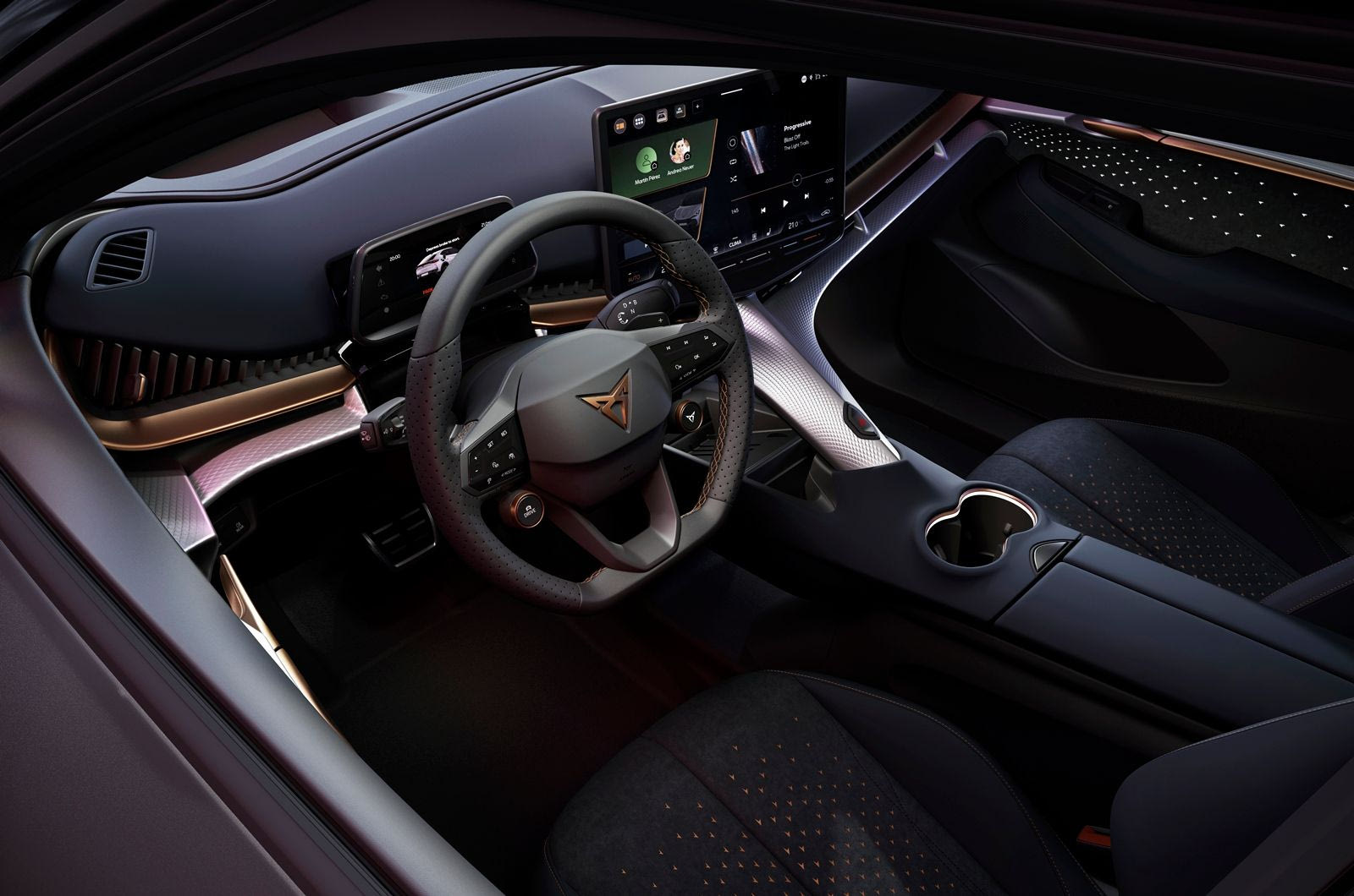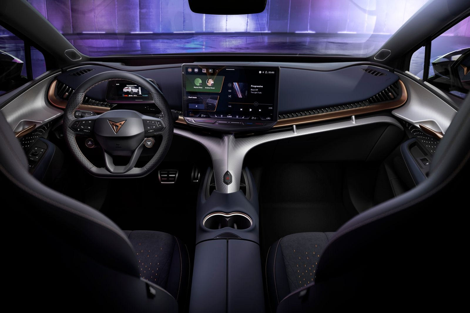 Φυσικά, ως τέκνο της εποχής του, το Cupra Tavascan είναι πλήρως ψηφιοποιημένο: η αιωρούμενη κεντρική οθόνη infotainment των 15 ιντσών -η μεγαλύτερη μέχρι στιγμής σε μοντέλο Cupra- διαθέτει ένα slider με ρετρό φωτισμό και ενσωματώνει μια νέα, εξελιγμένη διεπαφή ανθρώπου-μηχανής (HMI), που καθιστά το σύστημα infotainment ακόμη πιο βελτιστοποιημένο. Επίσης, ενσωματώνει το σύστημα Wireless Full Link, που φέρνει στην καμπίνα τόσο το Apple CarPlay όσο και το Android Auto.