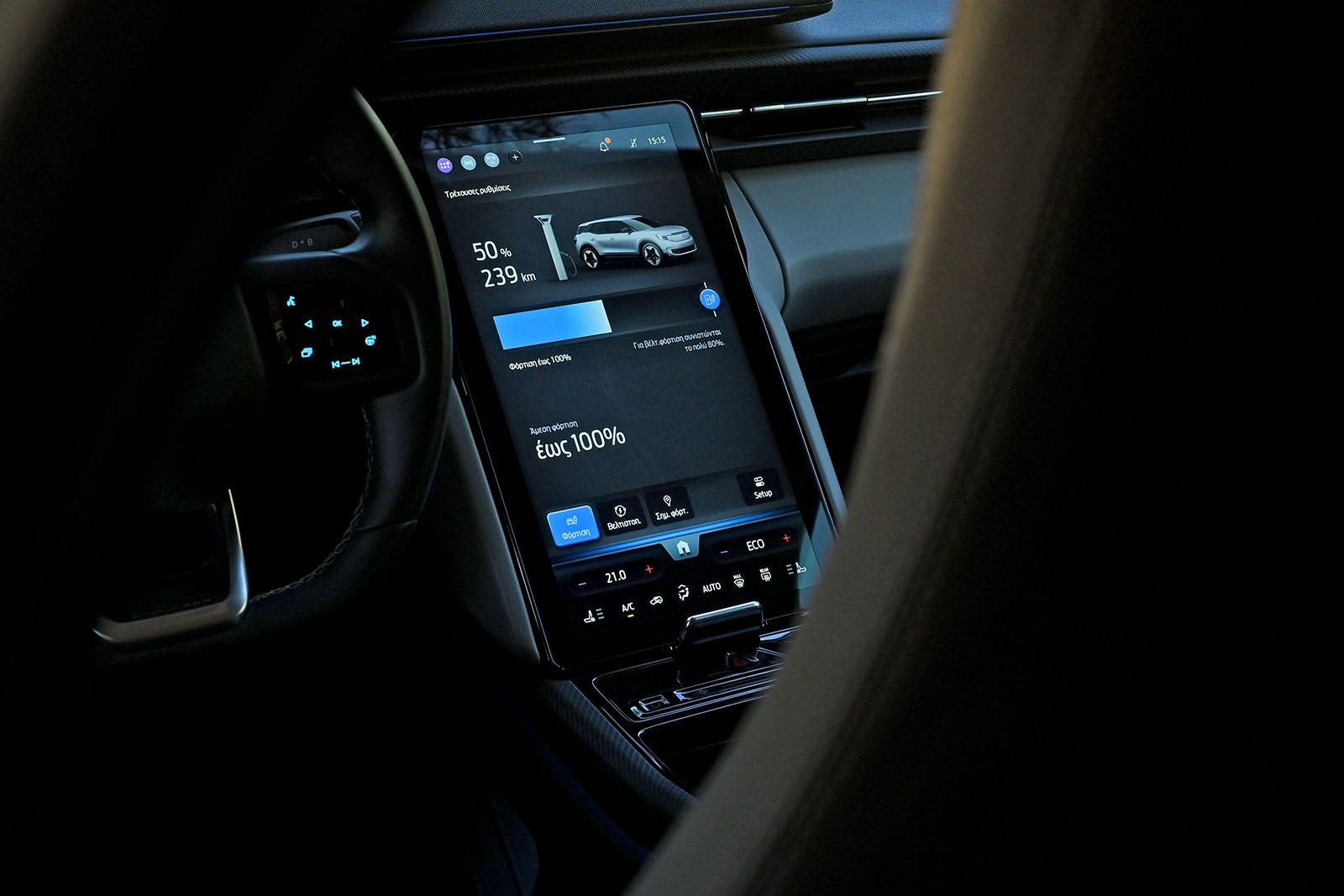 Στα προφίλ Normal και Sport, και τσιμπώντας λίγο παραπάνω το γκάζι, η κατανάλωση θα ανέβει στις 18,5 kWh/100km και η αυτονομία θα πέσει στα περίπου 420 χιλιόμετρα. Στην αυτονομία θα βοηθήσει αν βάλετε τον επιλογέα μετάδοσης στη θέση Β, αντί για τη D, ώστε να ανακτά την κινητική ενέργεια από την πεδήση και την κύλιση.