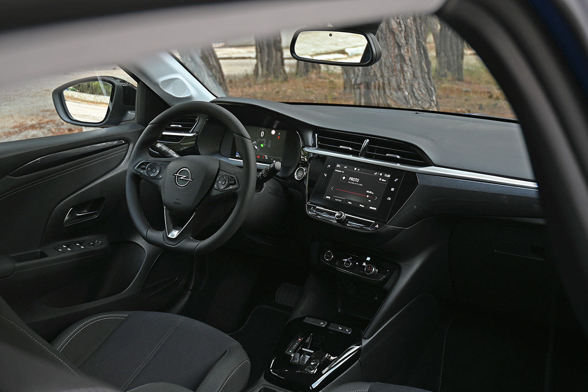 Το ηλεκτρικό Corsa αντίστοιχα παραμένει πανομοιότυπο και στο εσωτερικό του: με την ίδια απέρριτη, μινιμαλιστική σχεδίαση, που στέλνει όσο το δυνατόν πιο μπροστά το ταμπλό για τους μέγιστους χώρους, χωρίς άσκοπους εντυπωσιασμούς και με τα ίδια αξιόλογα υλικά.