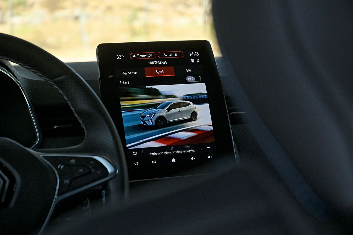 Κι έτσι φτάνουμε στο προφίλ σπορ, όπου ο βενζινοκινητήρας έχει τον πρώτο λόγο και το όλο σύστημα ξεδιπλώνει την πλήρη ισχύ των 145 ίππων με το βύθισμα του γκαζιού – με αποτέλεσμα το υβριδικό Clio του σχεδόν 1,3 τόνου να σημειώνει το sprint 0-100 km/h σε 9,3 δευτερόλεπτα, και να έχει πολύ ζωηρές και γεμάτες ρεπρίζ για κάθε ανάγκη προσπέρασης.